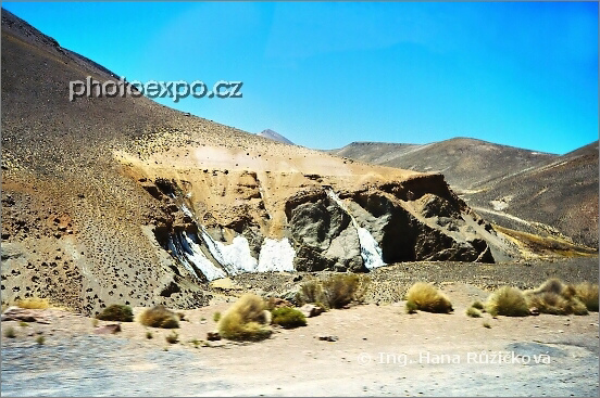 Nezastavujícím autobusem krajinou NP Lauca, Chile.
