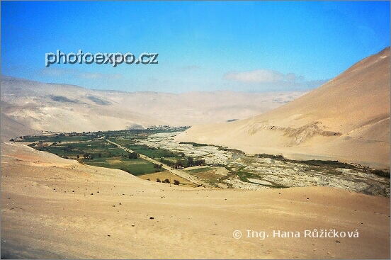 Zelené údolí v pouštní krajině Pampa Colorada za městem Arica. Chile