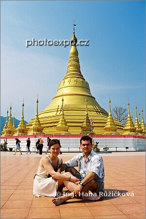 V dubnu 2003 jsem s tehdejším přítelem navštívila Thajsko a když jsme se dostali až na sever do Mae Sai, zaskočili jsme i do Myanmaru (Barmy) do městečka Tachileik. Jeho dominantou je napodobenina světoznámé pagody Shwedagon. Její originální název je snad Wat Phra That Doi Tachileik. Tuto fotku, na které jsem s přítelem, jsem zjevně nepořídila já, ale jeden náš spolucestující ze zájezdu. A fakt se mu povedla. Jen sedět na té rozpálené podlaze bylo poněkud ... drsné. Tachileik, Myanmar. p.s. Pro zájemce o pagodu mám samozřejmě i snímky bez našich maličkostí :=)