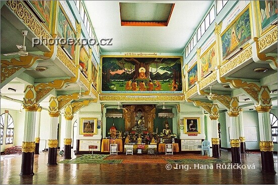 Interiér chrámu ve městě Tachileik. Zdroje uvádí, že se jedná o chrám Dhammayon, anglické verze pak Temple of Enrobed Elephant, tedy ve volném překladu "Oděný slon". Vzadu, vlevo za sloupem před oltářem spí mladík z fotky č. 23 :=) Tachileik, Myanmar.