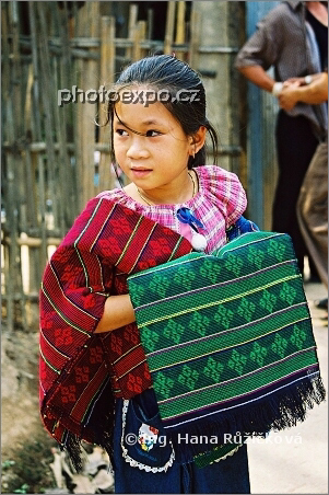 Dívka v domorodé části města Tachileik nám nabízela k zakoupení ručně tkanou látku. Myanmar