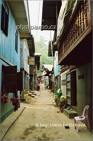 Uličky v typické, spíše vesnické domorodé části města Tachileik, Myanmar.