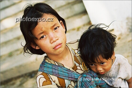 Sotva jsme překročili hranice z Thajska, už nás začaly atakovat místní děti a s poměrně velkou agresivitou si začaly říkat o peníze. Po zmapování okolí jsme si všimli, že jejich rodiče zpovzdálí sledují, jak se drobečkům daří. "Obchodní" taktika spočívá ve vyslání jednoho děcka, které je již schopno žebrat a které na sobě táhne podstatně menší robě, budící maximální soucit. Holčičce s bráškou věnujeme drobné, fotíme a kamerujeme ji. K našemu překvapení dává najevo svou nespokojenost s výší almužny a vehementně se domáhá dalšího příspěvku. Ten jí už však nejsme ochotni věnovat. Děti tu mají zjevně velmi těžký život. Tachileik, Myanmar.