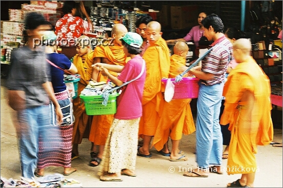 Mniši v pohybu... Překvapilo nás, že jsme na velkém trhu v Tachileiku potkávali mnichy, kteří si, pokud dodržují pravidla, sami nesmí nic kupovat a jídlo i další materiální statky smějí pouze přijímat od veřejnosti jako dary. Tachileik, Myanmar.