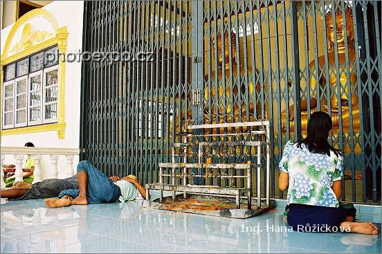 Někdo se u Buddhy modlí, někdo tu vyspává. Sochy Buddhy u pagody Wat Phra That Doi Tachileik. Tachileik, Myanmar.