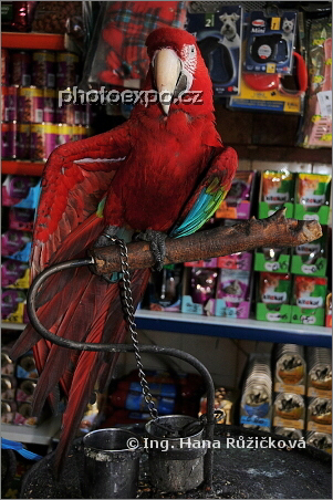 Producírující se ara ve zverimexu u náměstí Vounaki v hlavním městě Chíos. Řecko - Chíos.