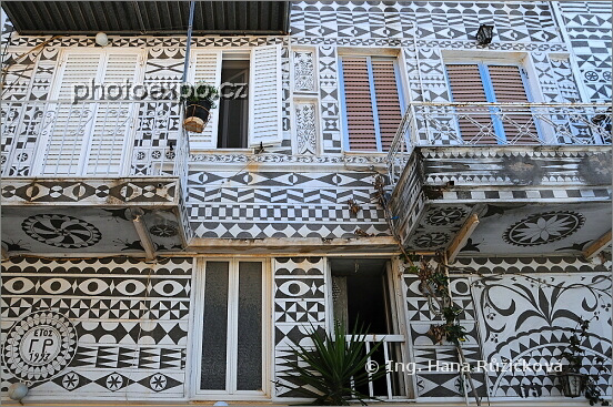 "Malovaná" středověká mastixová vesnice Pyrgi s domy zdobenými sgrafitem. Prostě malovaná pohádka. Řecko - Chíos.