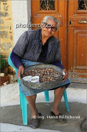 Starší paní vybírá z listů a kůry "slzy" pryskyřice řečíku lentišku, ze které se vyrábí různé sladkosti, kosmetiky, léky... Pyrgi, Řecko - Chíos.