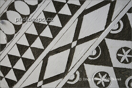 Sgrafitový detail v "malované" středověké mastixové vesnici Pyrgi. Sgrafito aneb "vyškrábaná nádhera" vzniká tak, že se škrábe do vrchní vrstvy ještě mokré omítky/barvy tak, aby byla vidět spodní barva. Vzniká tak barevné a plastické zdobení. Kromě Chíosu jsem se s tímto zdobením bohatě setkala ve Švýcarsku v údolí Engadin. Řecko - Chíos.