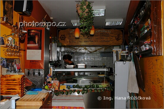 Interiér taverny na hlavním náměstí středověké vesnice Pyrgi, kde jsem obědvala ve stylu "vyber si jídlo z pultu a my ti ho naservírujeme ven ke stolu". Řecko - Chíos.