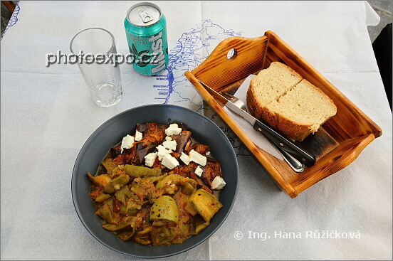 Jeden z mých vegetariánských obědů na cestách po ostrově Chíos: míchanice s lilkem a fetou a míchanice s cuketou + mastixová limonáda (byla fakt dobrá ;=) Obědvala jsem na hlavním náměstí středověké vesnice Pyrgi. Řecko - Chíos.