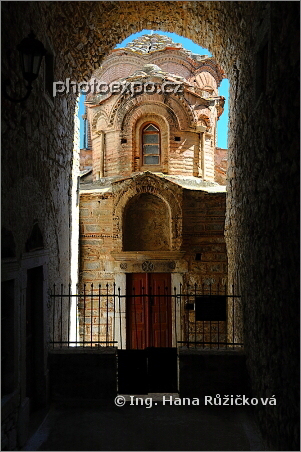 Byzantský kostel Aghios Apostoli (Saints Apostles) na konci průchodu vedoucího z hlavního náměstí středověké vesnice Pyrgi. Vskutku netradiční vstup do kostela a netradiční konec průchodu ;=) Řecko - Chíos.