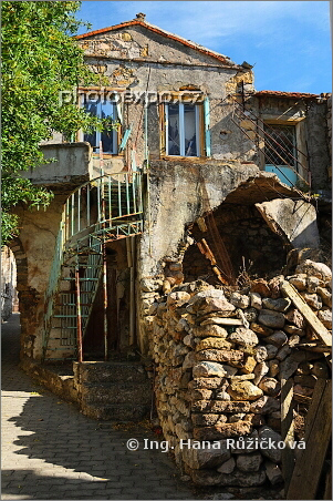 Polorozpadlý dům, na jehož schody jsem si troufla vylézt a fotila okolí. Krásná syrová starobylá naturální neturistická vesnice Zyfias. Řecko - Chíos.