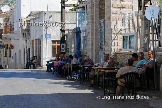 Posezení před kostelem v centru Aghios Georgios Sykousis, Řecko - Chíos.