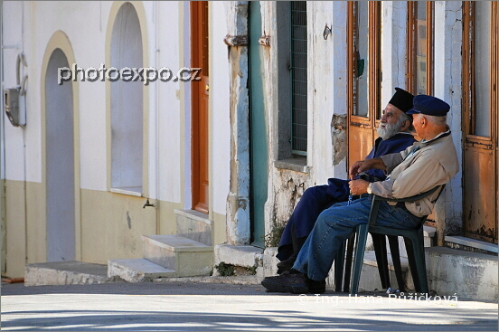 Posezení s pravoslavným popem v městečku Aghios Georgios Sykousis, Řecko - Chíos.