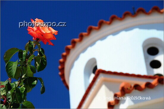 Růže a kostel v Aghios Georgios Sykousis, Řecko - Chíos.
