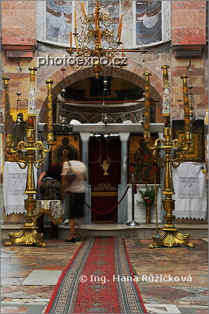Klášter Nea Moni, nejvýznamnější klášter Chiosu ležící v centru ostrova. Jsem v interiéru kostela tzv. katholikonu a exonartexu se vzácnými freskami a mozaikami - zde čelní část kostela (katholikonu) s oltářní přepážkou, podlahou z mramorových dlaždic. Věřící s úctou líbají přes sklo obrázky svatých. Řecko- Chíos.