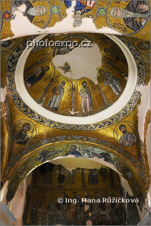 Klášter Nea Moni, nejvýznamnější klášter Chiosu ležící v centru ostrova. Právě jsem v interiéru kostela tzv. katholikonu a exonartexu se vzácnými freskami a mozaikami - fresky a malby v Exonartexu (nartexu). Řecko - Chíos.