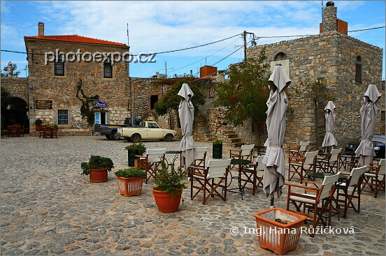 Hlavní náměstí s tavernou Pyrgos ve středověké věži, kde jsem si dávala imam (lilek s rajčaty a česnekem). Avgonyma (Hnízdo vajec), starobylá vesnice z 11. století na vrchu kopce ve střední části Chía. Řecko - Chíos.