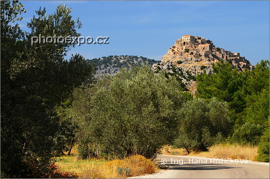Anavatos, neviditelná vesnice severně od Avgonymy. Od r. 1822, kdy všichni obyvatelé spáchali sebevraždu skokem z místní skály, aby nepadli do rukou Turkům, je vybydlená a s pobořenými domy. Zde je pohled na Anavatos z příjezdové silnice od Avgonymy. Řecko - Chíos.