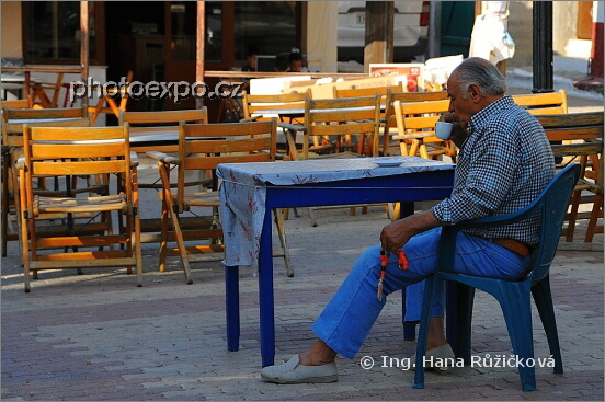 Muž relaxující na hlavním náměstí vesnice Lithi u západního pobřeží ostrova. Řecko - Chíos.