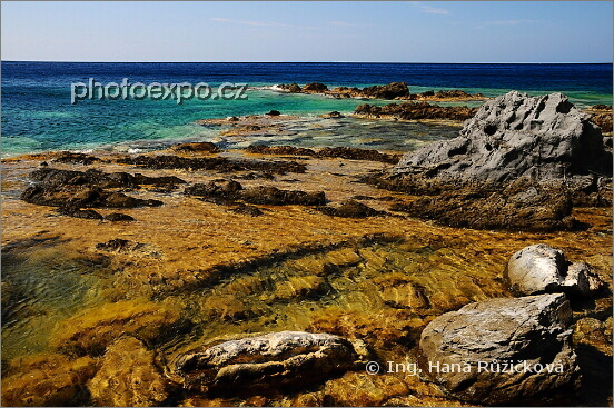 Moře vedle cesty od pláže Aghia Makrela po úbočí skal k místu mučednictví (Martyrdom) a ke svaté studánce (Hagiasma). Řecko - Chíos.