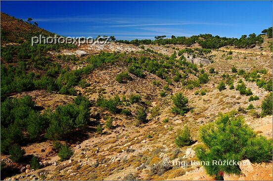 Krajina piniových borovic na cestě mezi vesnicí Pityos a klášterem Moundhon Moni (Dhiefcha). Řecko - Chíos