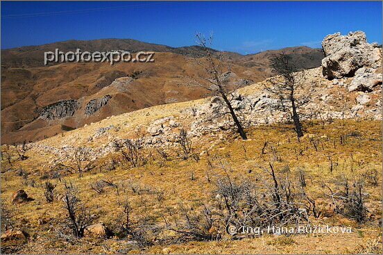 Následky požárů v krajině na cestě od kláštera Moundhon Moni (Dhiefcha) k vesnici Fita. Řecko - Chíos