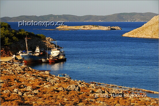 Vrakoviště lodí a opravna v zátoce u Cape Pachi. Řecko - Chíos