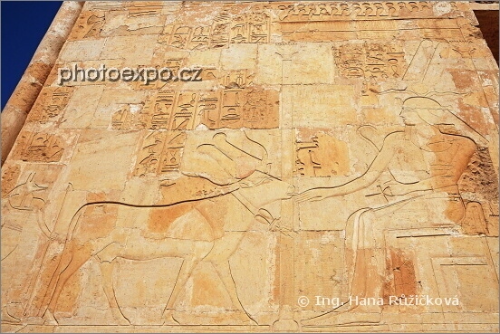 Reliéf kravské podoby bohyně Hathor lízající ruku královny Hatšepsut. Hathořina kaple v Hatšepsutině chrámu, Dér el-Bahrí, Egypt.