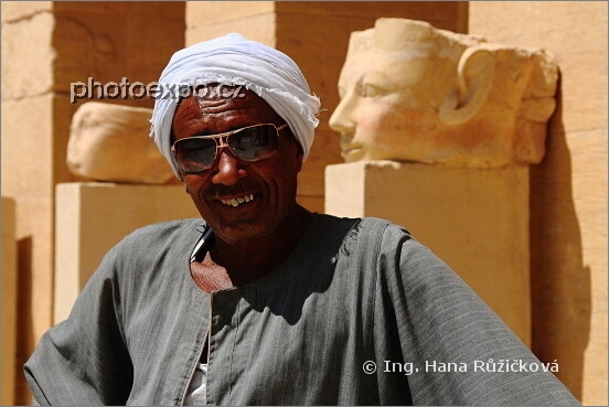 Dobrovolný průvodce v Hatšepsutině chrámu, díky jehož "placené ochotě" jsem si mohla nafotit nejkrásnější hlavu Hatšepsuty. Je jedním z mnoha Egypťanů, kteří sami sebe pasují na vaše dočasné zaměstnance, pokud se zrovna ocitnete v jimi "obývané" egyptské památce. Aniž se vás ptá, začne vám ukazovat různé reliéfy, vysvětlovat, co co znamená, má vás k tomu, abyste ho následovali, protože jinak přijdete o něco opravdu zajímavého... a poté natáhne dlaň a čeká. A když mu v ní nic nepřistane, umí být velmi nepříjemný. Pokud nechcete, aby se vás celou dobu držel jako klíště, musíte být důrazní a často až drsní :=) Dér el- Bahrí, Egypt.