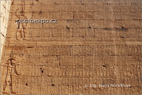 Reliéfy a rytiny pokrývají stěny nezastřešené chodby lemující Horův chrám v Edfu, Egypt .