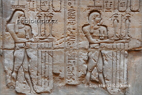 Nádherné reliéfy v Horově chrámu, nejkrásnějším ze všech monumentů na břehu Nilu mezi Asuánem a Luxorem. Edfu, Egypt.