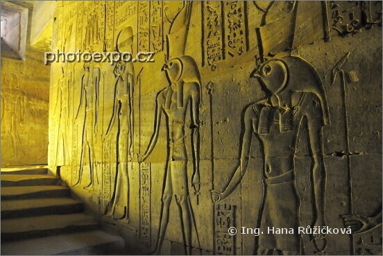 Schody vedoucí z obětní síně na střechu Horova chrámu lemují výjevy z novoroční slavnosti. Edfu, Egypt.