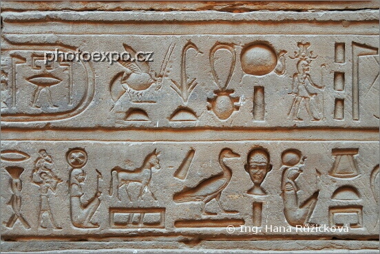 Nádherné reliéfy v Horově chrámu, nejkrásnějším ze všech monumentů na břehu Nilu mezi Asuánem a Luxorem. Edfu, Egypt.