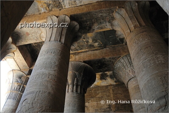 Nádherně zdobené a zachovalé sloupy prvního hypostylu Horova chrámu v Edfu. Stropy jsou začouzené od toho, jak tu bydleli a vařili křesťané. Egypt