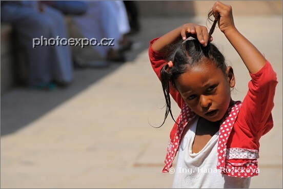 Holčička upravující si svůj culík před Horovým chrámem v Edfu. Egypt