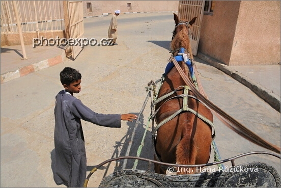 Drožkou jsme k Horovu chrámu v Edfu přijeli a také jí odjíždíme. Vedle mě na kozlíku je jeden chlapík a k tomu mu pomáhá malý kluk. Avšak ani asistence dvou "odborníků" nezabránila chvilkovému splašení koně. Byl to docela adrenalin, jestli ho zvládnou nebo ne. Ostatně, mě by to na místě toho koně také nebavilo... Všimla jsem si, jak má tělo odřené do krve od popruhů... Egypt.