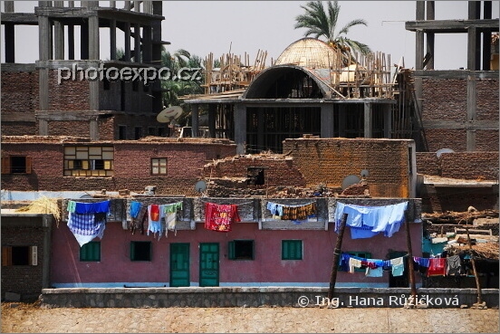 Bydlení na břehu Nilu... Svérázně rozestavěné domy, prádlo vyprané ve vodách Nilu a samozřejmě nikde nesmí chybět satelity... Egypt