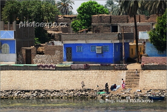 Vesnický život na břehu Nilu mezi Edfu a Kóm Ombo. Pere se prádlo, deky, koberce...a poté suší na sluníčku. Egypt