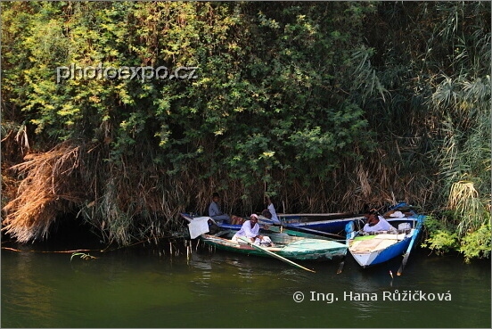 Hlavně se dobře schovat, aby nás neviděli, nešlo na nás sluníčko a pěkně se spalo... Přístup, který razí mnozí Egypťané v "pracovní době" a to i tito rybáři, které jsme míjeli při plavbě po Nilu. Dokud jsme jim nebyli s naší obrovskou lodí Monicou bok po boku, opravdu jsme je schované u břehu pod stromy neviděli. Egypt