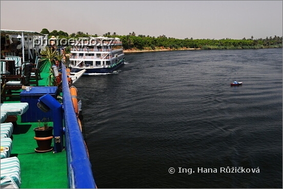 Ryze dokumentární fotografie pro porovnání velikosti našich turistických luxusních obytných lodí a bárky malého rybáře. Podobné loďky nás míjely častěji a nejednou měli velkou odvahu se k nám přiblížit na dotek. Nil, Egypt.