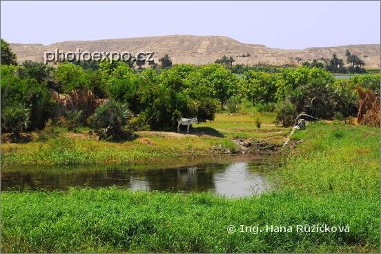 Oslík a "profesionální" zařízení na odčerpávání nilské vody v zeleni táhnoucí se do šíře 20 km kolem Nilu....a pak už jen vyprahlo a poušť. Egypt