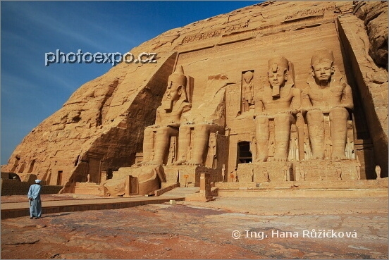 Fascinující chrám v Abú Simbelu můžeme dodnes obdivovat jen díky záchranné akci UNESCO. Původně se totiž nalézal o 65 m níže. Kdyby nebyl rozřezán, převezen a znovu sestaven, byl by nyní zaplaven novou Velkou asuánskou přehradou. Na svou počest jej nechal postavit nejmocnější z faraonů Ramesse II. a zasvětil jej třem bohům - Reharachtejovi, Amonovi a Ptahovi. Všechny čtyři kolosy však znázorňují výhradně samotného egocentrického faraona. Hlídač chrámu jde právě do služby a v rukou třímá klíč od chrámu v podobě zlatého Nilského kříže. My jsme se k chrámu dostali po více jak tříhodinové cestě pouští z Asuánu za policejního doprovodu a to brzy ráno, abychom nepadli vedrem. Vstávat jsme museli po třetí hodině ...