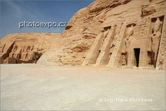 Abú Simbel a oba jeho chrámy, Velký chrám s kolosy Ramesse II. (vlevo) a Hathořin chrám se čtyřmi kolosy Ramesse II. a dvěma jeho oblíbené manželky Nefertari (vpravo). Oba chrámy byly rozřezány, přeneseny a znovu sestaveny o 65 m výše než původně stály. Díky záchraně UNESCO tak nebyly zaplaveny vodou z nové Velké asuánské přehrady. Egypt