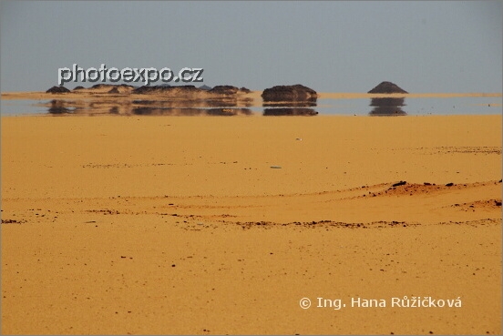 Vypadá to jako jezero v dálce? Ale není to jezero, je to Fata Morgana na egyptské poušti. Viděli jsme ji cestou z Abú Simbel zpět do Asuánu. Egypt
