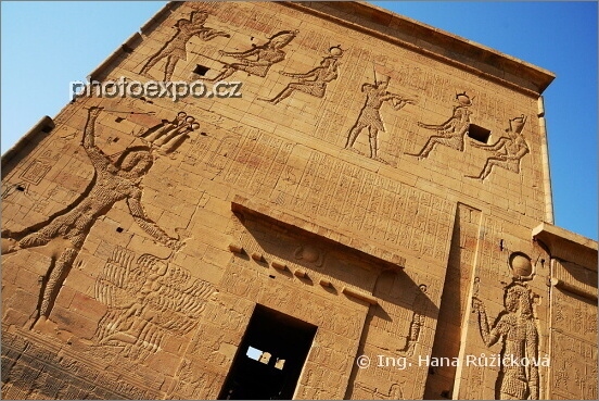 První pylon chrámu bohyně Esety ve Fílé s reliéfy faraona Ptolemaia XII. pobíjejícího své nepřátele za příhlížení Esety, Hora a Hathory. A také příkladná ukázka křesťanské devastace zobrazení pohanských bohů... Ostrov Aglikia, Egypt.