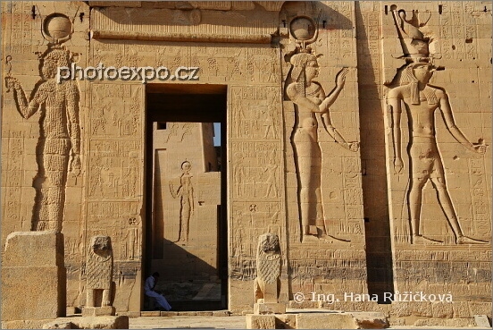 Zachovalé i křesťany škrábáním poničené reliéfy prvního pylonu Esetina chrámu ve Fílé. A také strážní lvi a nezbytný hlídač schovaný ve stínu starobylé stavby, který nás hlídal asi tak stejně intenzivně, jako ti lvi...:=) Ostrov Aglikia, Egypt.