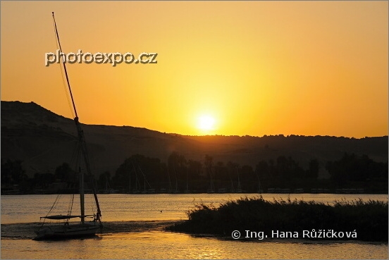Nádherný západ slunce s drobnou felukou uprostřed nilských vod. Asuán, Egypt.