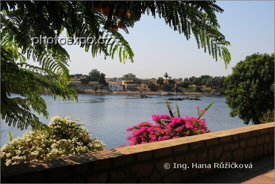 Průhled florou botanické zahrady zbudované britským generálem Horatiem Kitchenerem v 90. letech 19. století na Nil a Asuán. Egypt